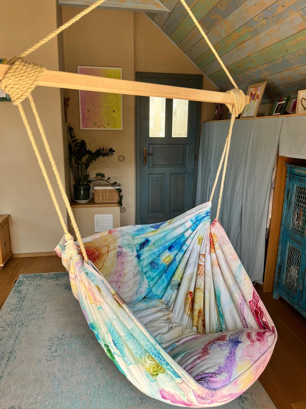 Křeslo lze zavěsit do stropu, do trámu, na větev - více v článku INSTALACE